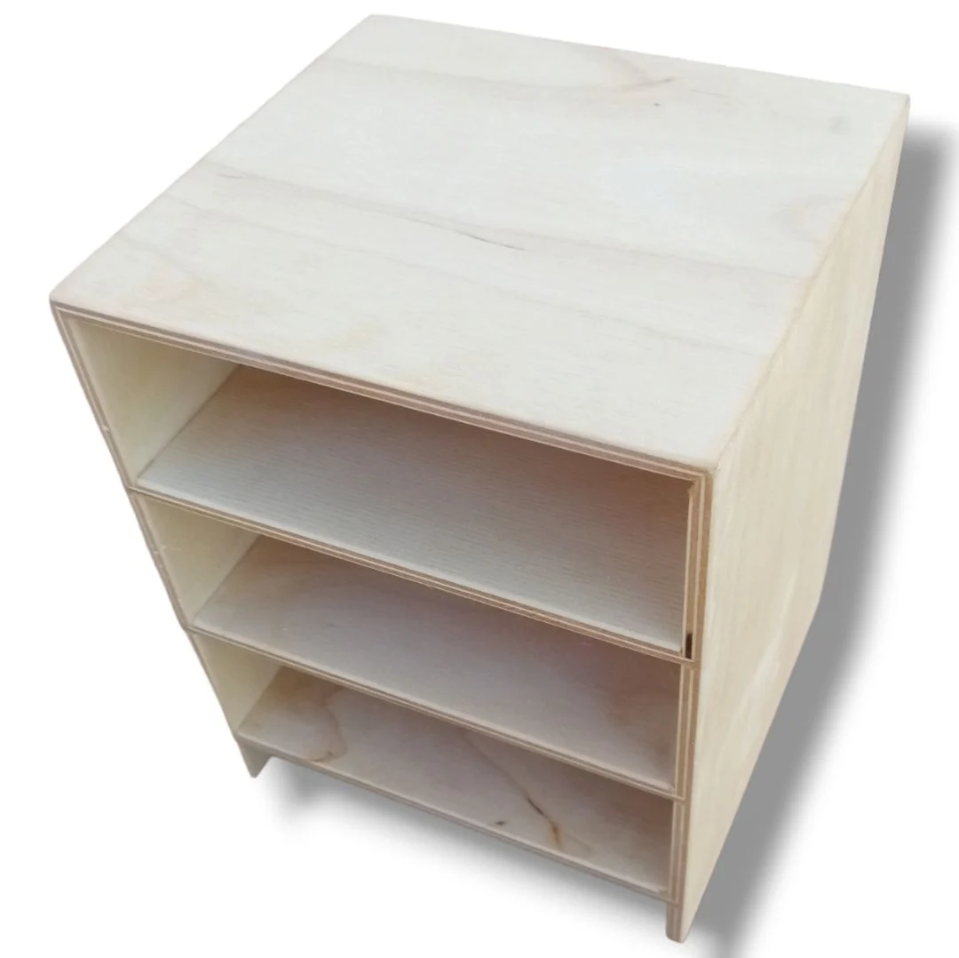 Geometrik kabin kartları ve yaprak komodini kartları için üç bölmeli raf.